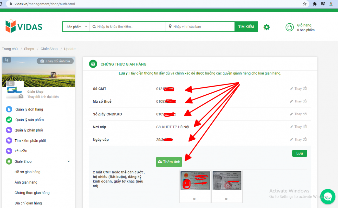 + Nếu là Gian hàng tổ chức ( Doanh nghiệp, HTX, tổ chức có pháp nhân khác), người bán cần điền đầy đủ Mã số thuế, Số giấy chứng nhận Đăng ký kinh doanh (CNĐKKD), ngày cấp, nơi cấp và upload ảnh xác thực giấy CNĐKKD: