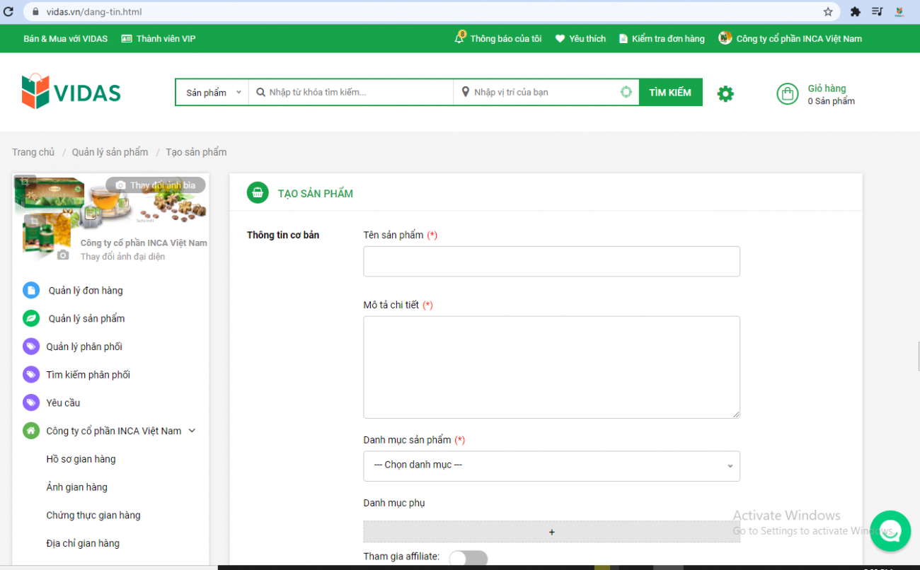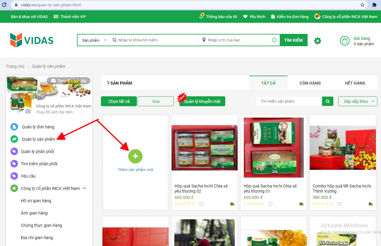 + Sau khi đã đăng nhập vào tài khoản trên VIDAS.VN, người dùng có thể đăng bán sản phẩm bằng cách nhấn vào nút quản lý sản phẩm ở góc bên trái trên thông tin gian hàng của VIDAS.VN