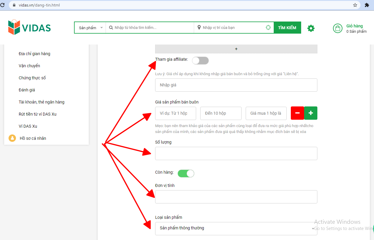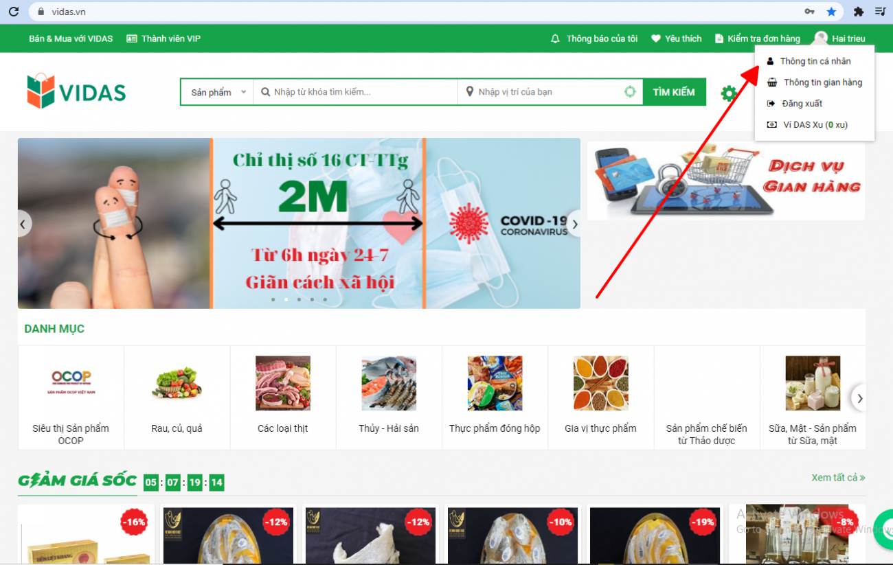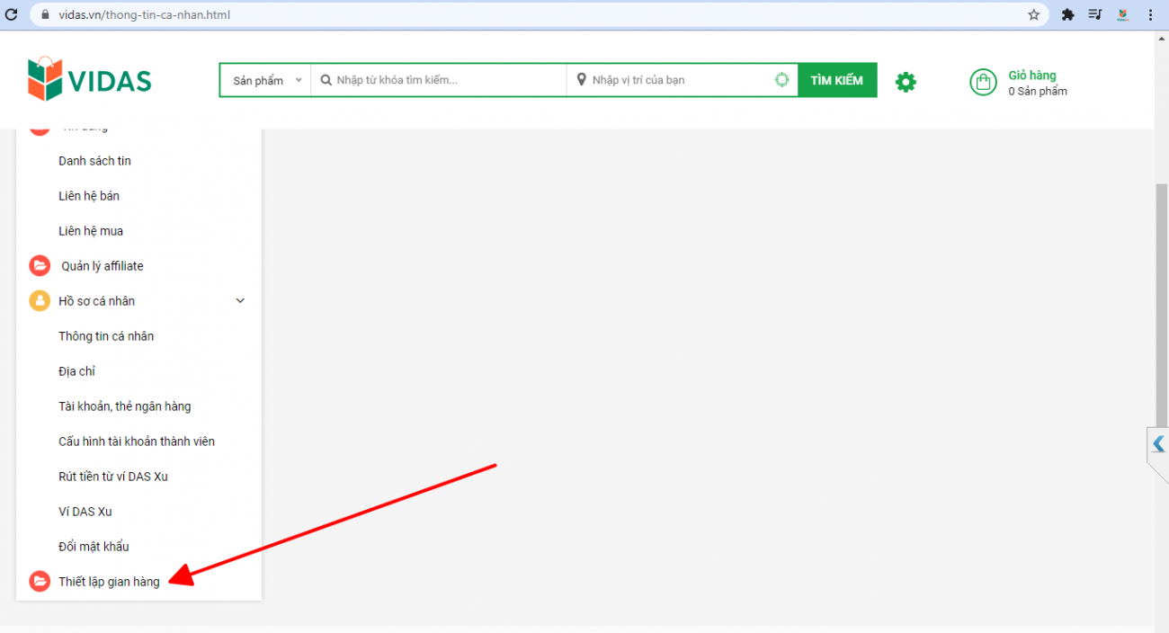 Người bán tiến hành đăng bán các sản phẩm của mình bình thường và các sản phẩm sẽ được đưa về chung trong gian hàng vừa được tạo lập. Người bán có thể đăng nhập vào tài khoản trên sàn VIDAS.VN của mình, di chuột đến tên mình và click vào dòng chữ Xem Gian Hàng để kiểm tra lại thông tin.