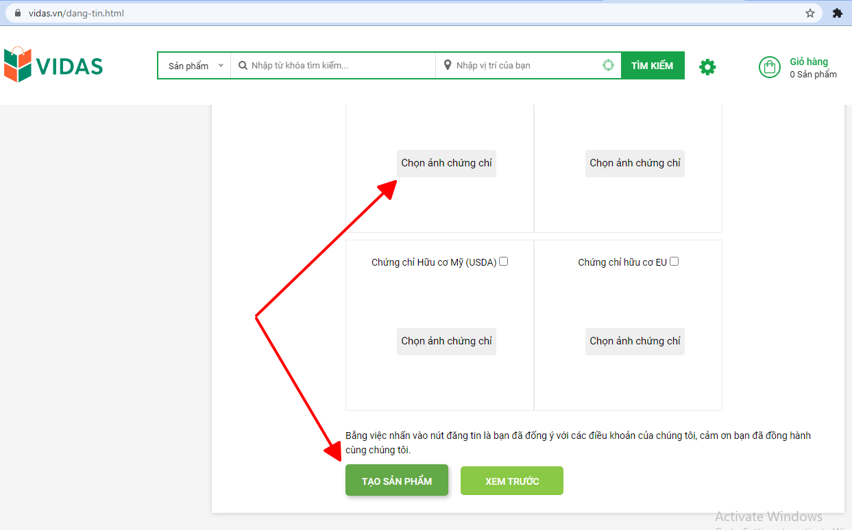 Khi đã điền đầy đủ các thông tin theo yêu cầu, người dùng có thể nhấn nút XEM TRƯỚC để duyệt lại nội dung trang sản phẩm của mình hoặc nhấn nút TẠO SẢN PHẨM để đăng sản phẩm lên gian hàng.
