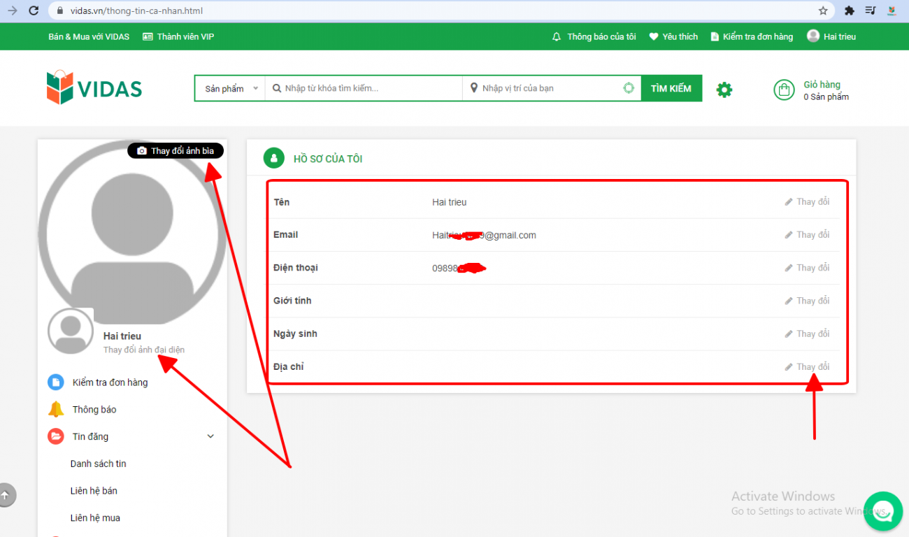 + Cập nhật thông tin cho tài khoản của bạn theo hướng dẫn như hình sau: