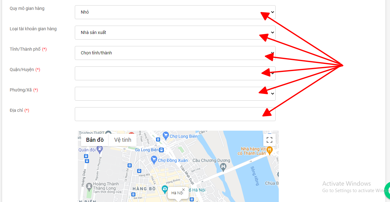 + Tiếp đó người bán điền đầy đủ thông tin về địa chỉ (Tỉnh/ Thành, Quận/ Huyện, Phường/ Xã, địa chỉ chi tiết), Số điện thoại liên lạc, Email; Mô tả ngắn về Gian hàng và Giới thiệu gian hàng: